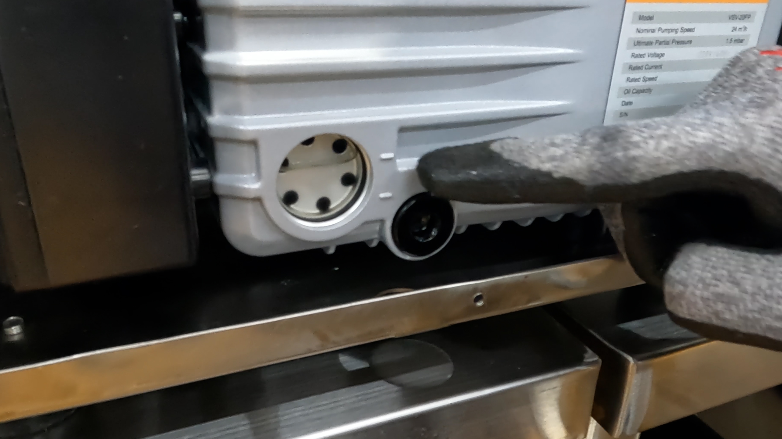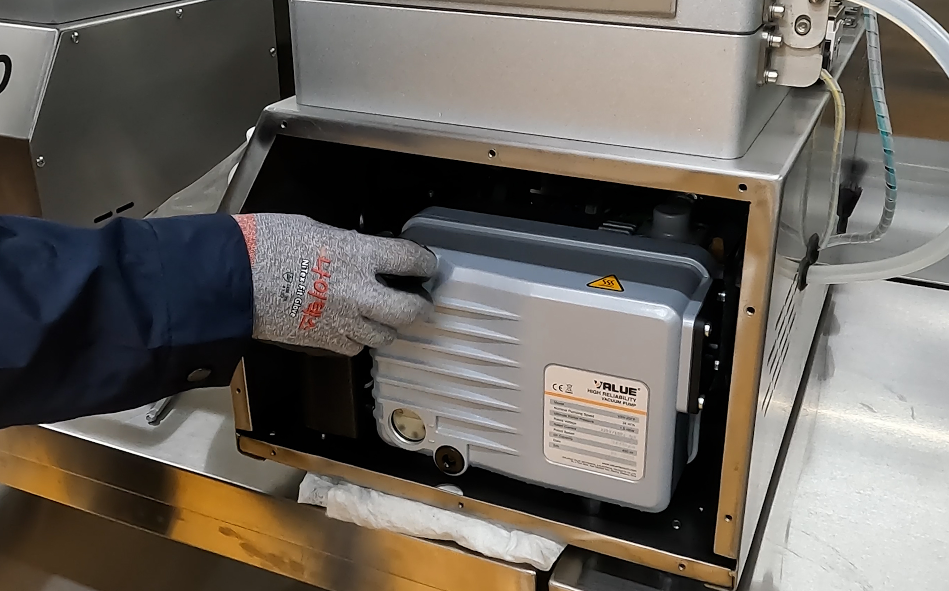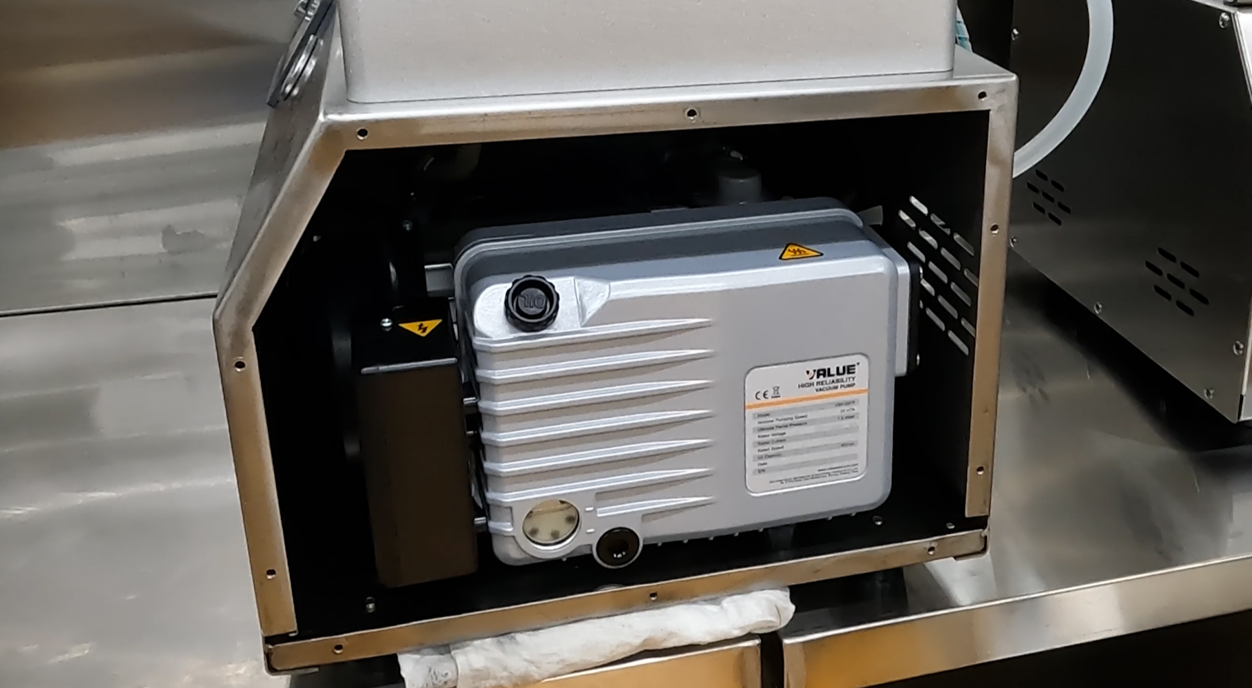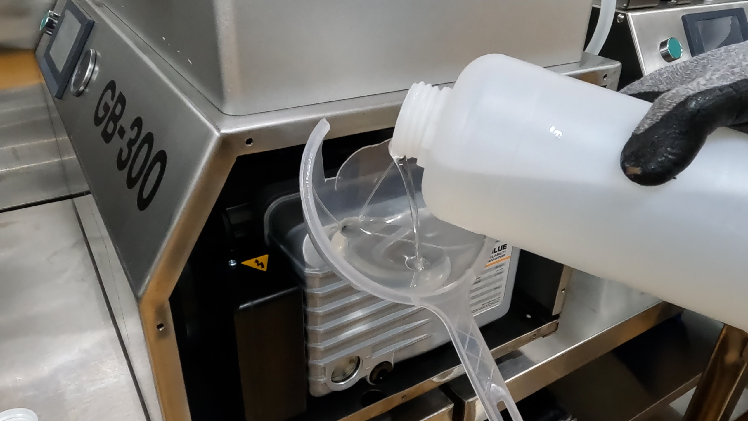 GB-300 장비의 오른쪽 커버를 열면 진공펌프가 위치해 있습니다.