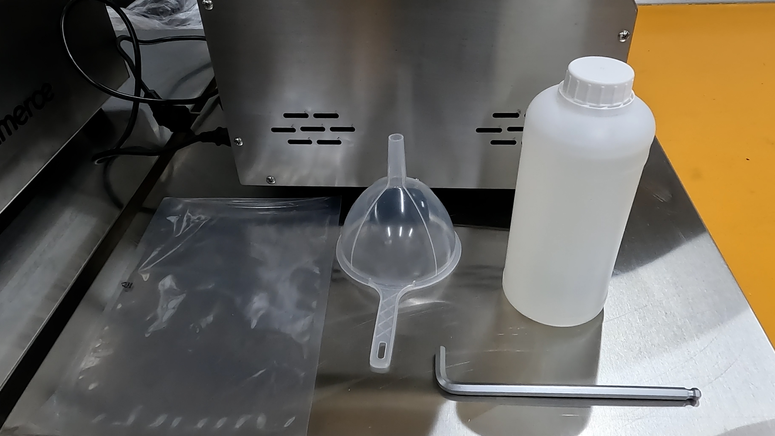 깔때기를 이용해 표시선 기준 중간보다 약간 위까지 채웁니다.