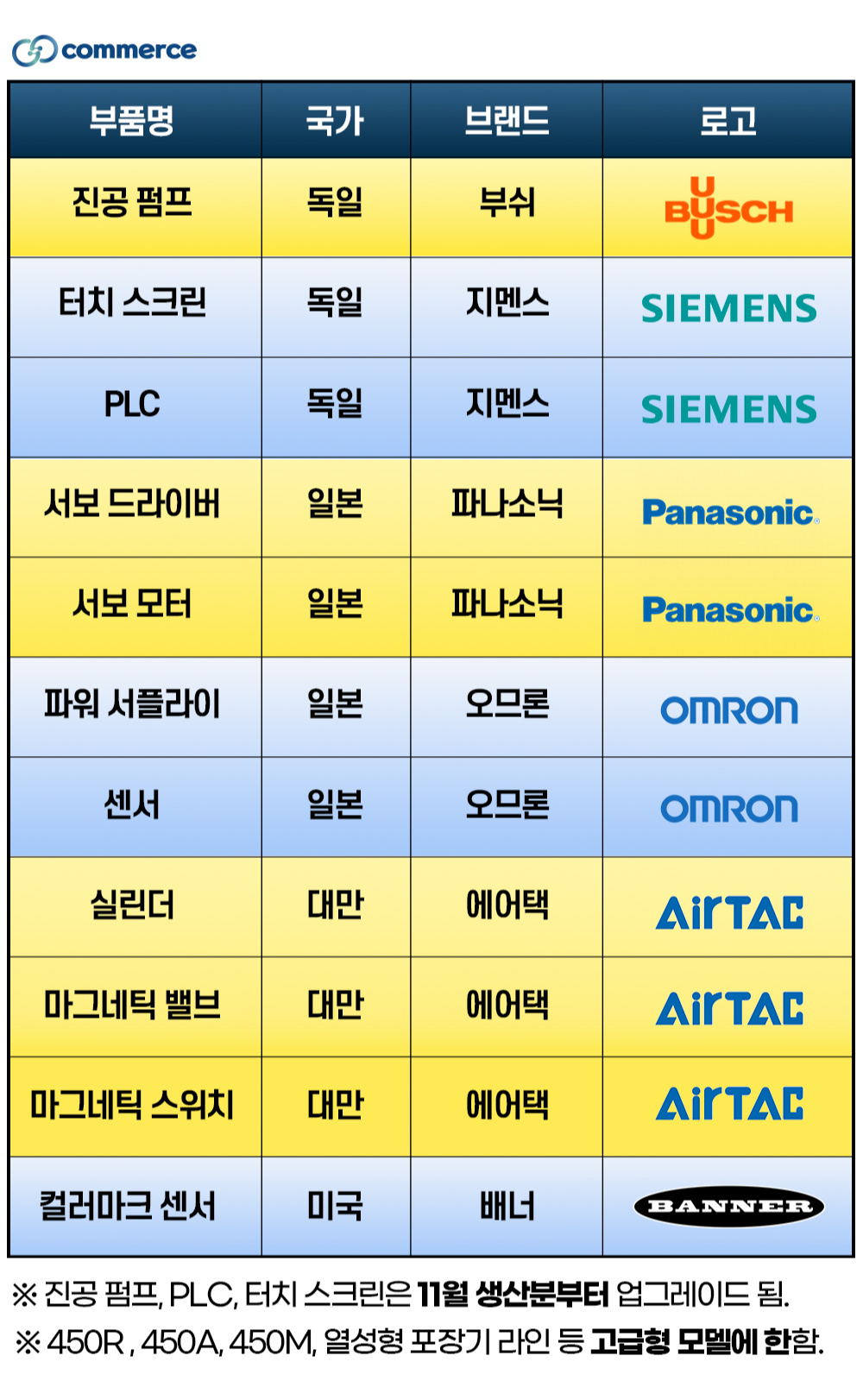 지지커머스 멀티 포장기 주요 부품은 누구나 다 알고 있는 세계적인 브랜드의 최고 제품을 사용하기 때문에 자랑스럽게 알려드립니다.